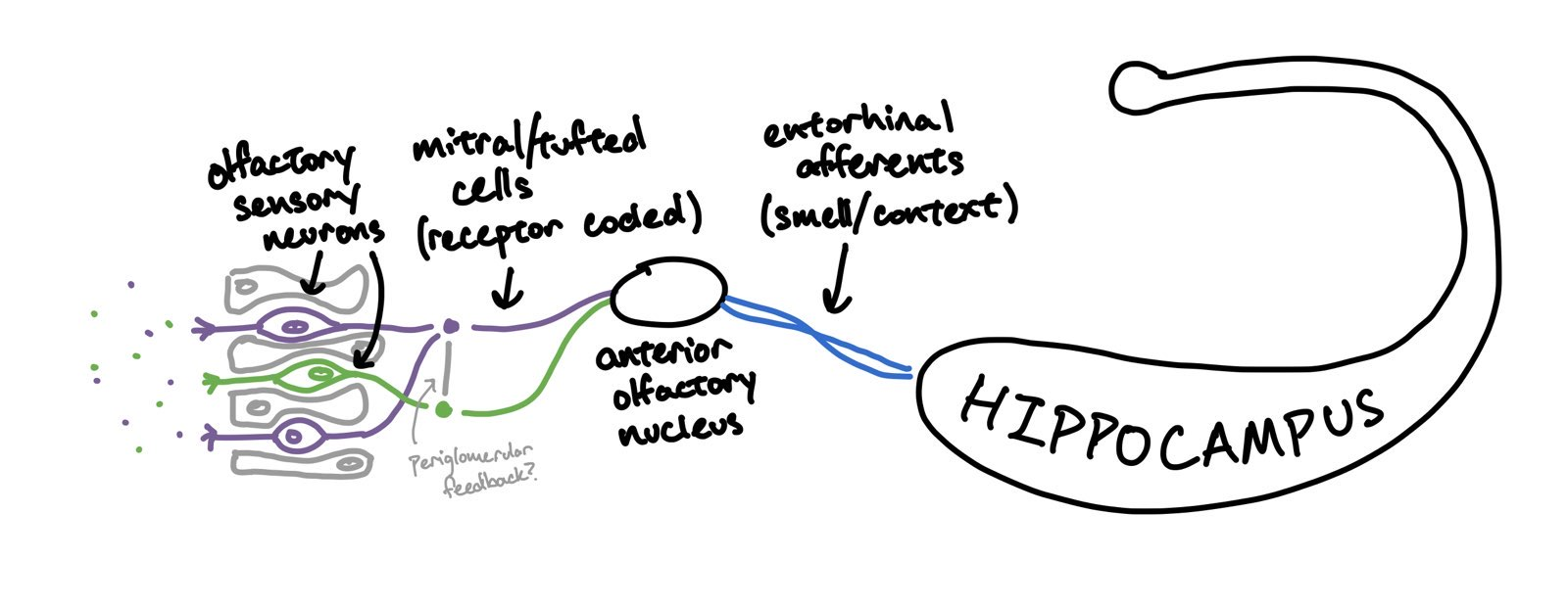 In contrast, only a few synapses separate the olfactory receptors from the hippocampus This is why certain smells bring up such strong memories!, which is responsible for memory, as well as from the amygdala, which does emotional regulation.